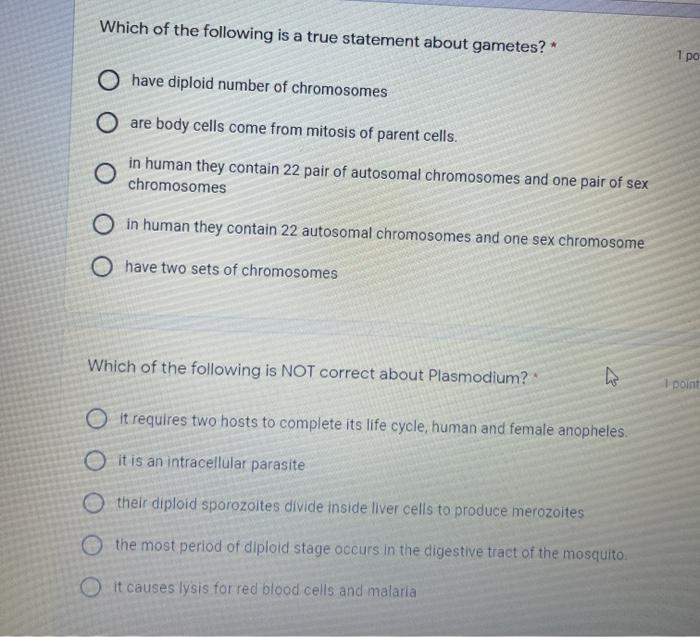 If false correct the statement. Plasmodium cells infect two specific types of cells in humans. Which of the following is a correct statement about gametes.