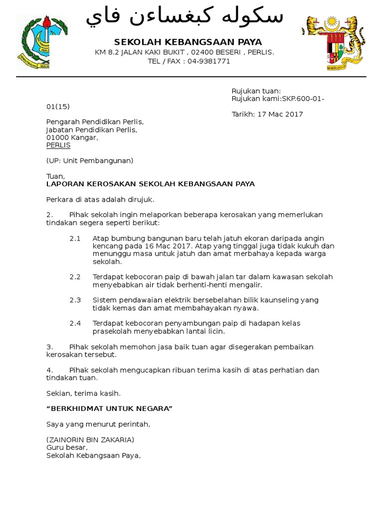 Contoh Surat Baiki Pulih Perpaipan Air Di Sekolah